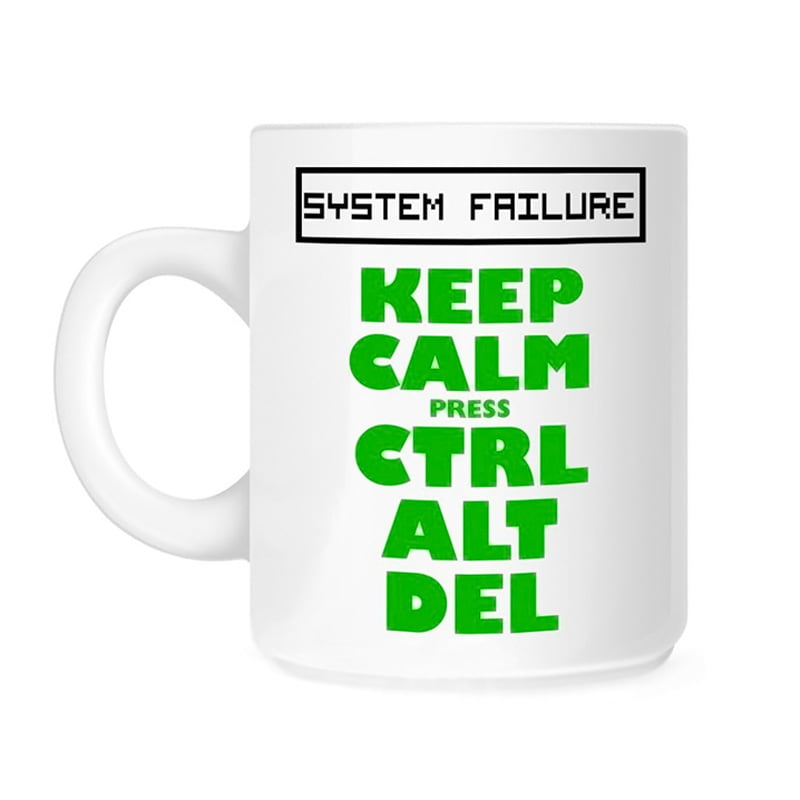 De mok is op de voor- en achterzijde voorzien opdruk en tekst “SYSTEM FAILURE – Keep Calm Press Ctrl Alt Del”.